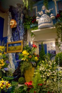 Pórtico com tamancos holandeses pendurados e flores