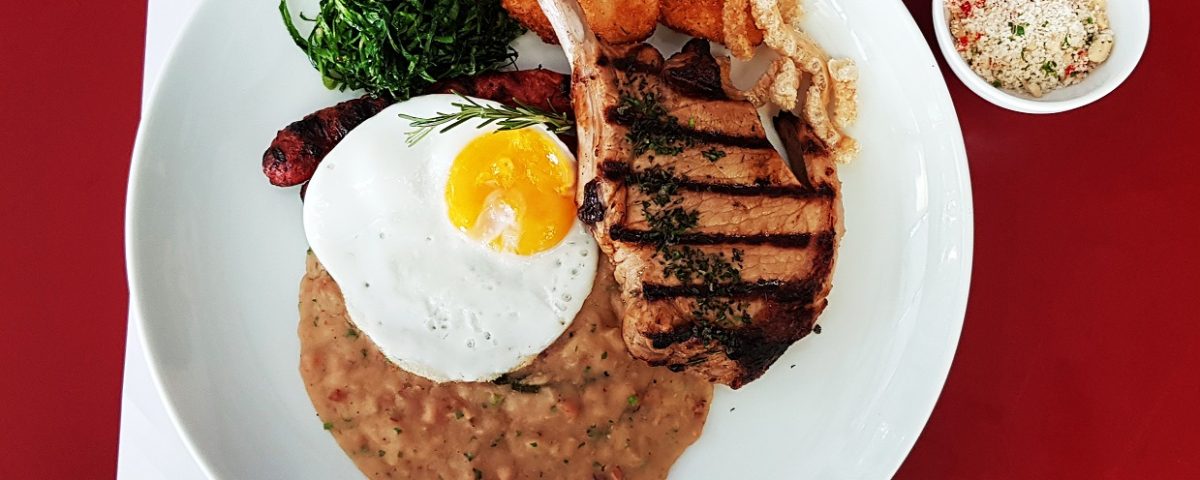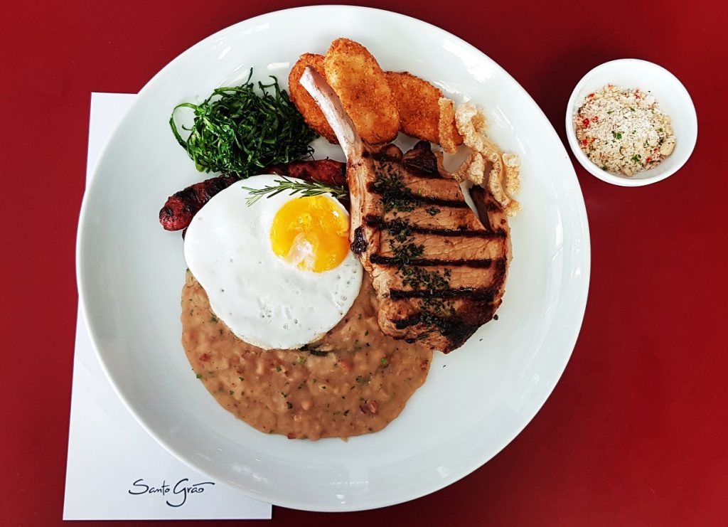 A receita, elaborada pela chef de criação do Santo Grão, Marcela Neilly, leva tutu – com feijão branco! “É mais leve, rico em vitaminas e ressalta o tempero do tutu e da própria farinha”, explica Marcela. No lugar da bisteca, o Prime Rib – corte nobre da carne de porco – ganha destaque, temperado com limão, pimenta do reino, sal e pimenta chipotle, é feito direto na grelha e finalizado no forno com manteiga de garrafa. E não pode faltar o torresminho crocante, que tem menor teor de gordura do que os demais. Finalizam o prato a banana fatiada e aromatizada com alecrim e a linguiça de lombo. O arroz de jasmim e farofa picante de castanha e tapioca são servidos como acompanhamento.