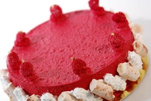 bolo de sorbet de framboesa, glace de baunilha e merengue.