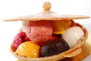 imitação de uma panela feita com nougatine (amêndoas caramelizadas) recheada de sorvetes de sabores variados.