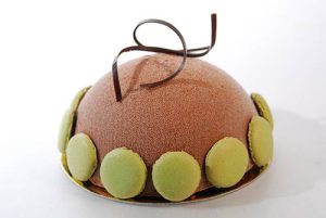 glace de chocolate e pistache, pão de ló de chocolate pulverizado de chocolate e decorado com macarons de pistache e chocolate.