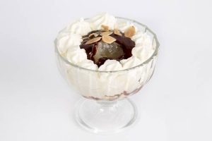 glace baunilha, pêssego em caldas, calda de framboesa, amêndoas afiladas, decorado com calda de chocolate. Preço: R$ 26,50