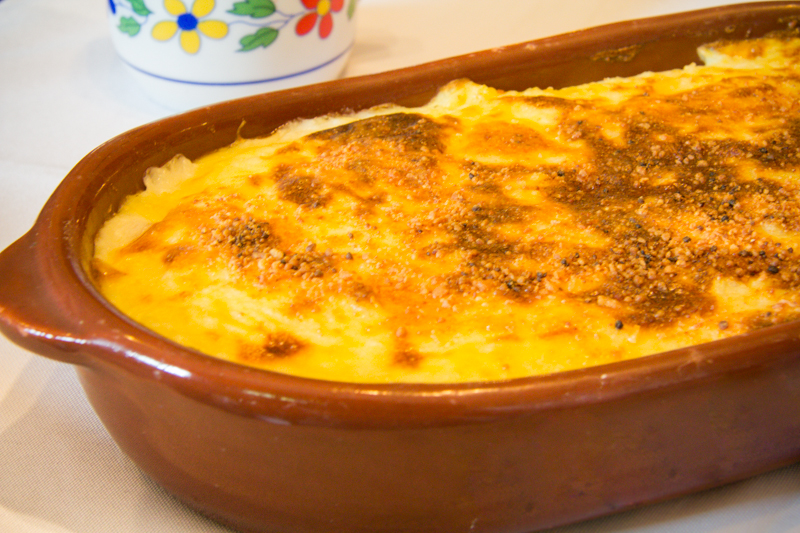 Na entrada os Bolinhos de Bacalhau redondos são servidos sequinhos e com uma quantidade considerável de Bacalhau em relação à acompanhante Batata da receita. Esta é uma das maiores heranças da mesa Lusitana na cidade e já foi considerada para ser uma das Maravilhas da Gastronomia Portuguesa.