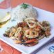 Um dos destaques da casa, o Filé de Linguado à Belle Menieure com molho de alcaparras, camarão e champignon, acompanha batata sautè e arroz com amêndoas.
