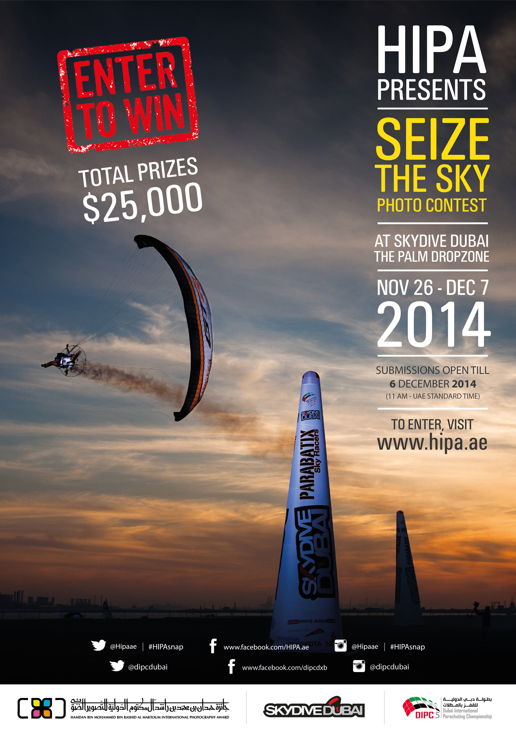 O Hamdanbin Mohammed bin Rashid Al Maktoum International Photography Award (HIPA) lançará um concurso fotográfico com o tema ‘Seize the Sky’ durante o 5o Campeonato Internacional de Paraquedismo de Dubai (DIPC 5). O concurso acontecerá no Skydive Dubaide 26 de Novembro até 6 de Dezembro de 2014.
