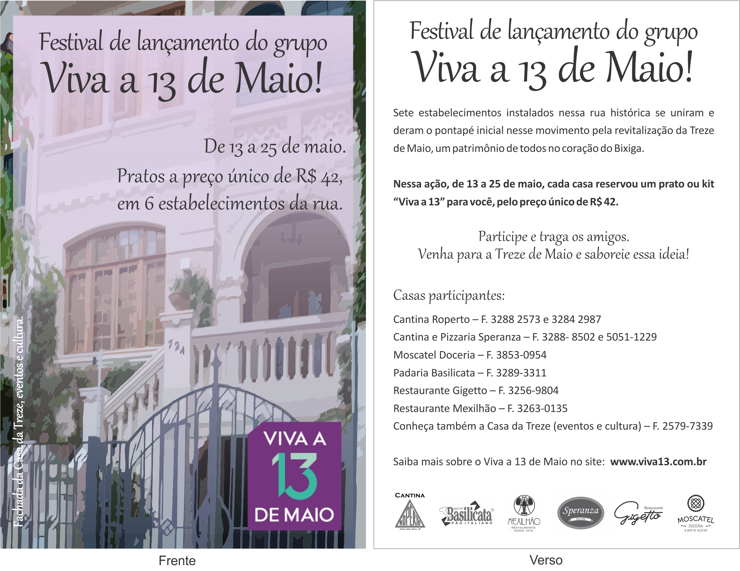 “Viva a 13 de maio” é o primeiro evento dentre muitas ações do Grupo Viva a 13. Com essa ação, o grupo, integrado também pela Casa da Treze Eventos e Cultura, mostra ao público essa união pela melhoria da Rua Treze de Maio, o coração do Bixiga. A ação propõe também uma pesquisa sobre a rua e o Bixiga, para que os frequentadores desses estabelecimentos possam expressar opiniões sobre a região e suas necessidades.