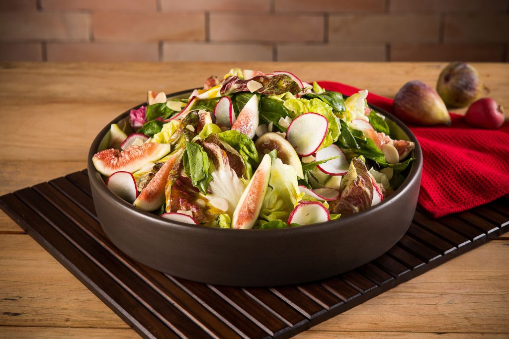Palmito, mesclun de folhas e acompanhamentos