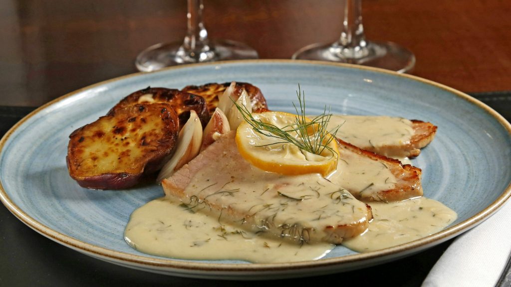 Picanha suína fatiada ao molho de limão siciliano. Acompanha batata doce grelhada e cebolinha em conserva.