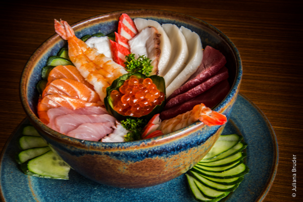 O exuberante Tirashi Honkê combina fatias de salmão, atum, peixe branco, polvo, kani e camarão, montado sobre shari temperado com furikake e ovas de massago e ikurá (R$ 68,00).