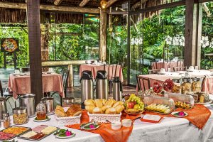 O café da manhã é uma atração a parte, com vários itens e receitas feitas na hora, em salão totalmente cercado de pássaros e natureza.