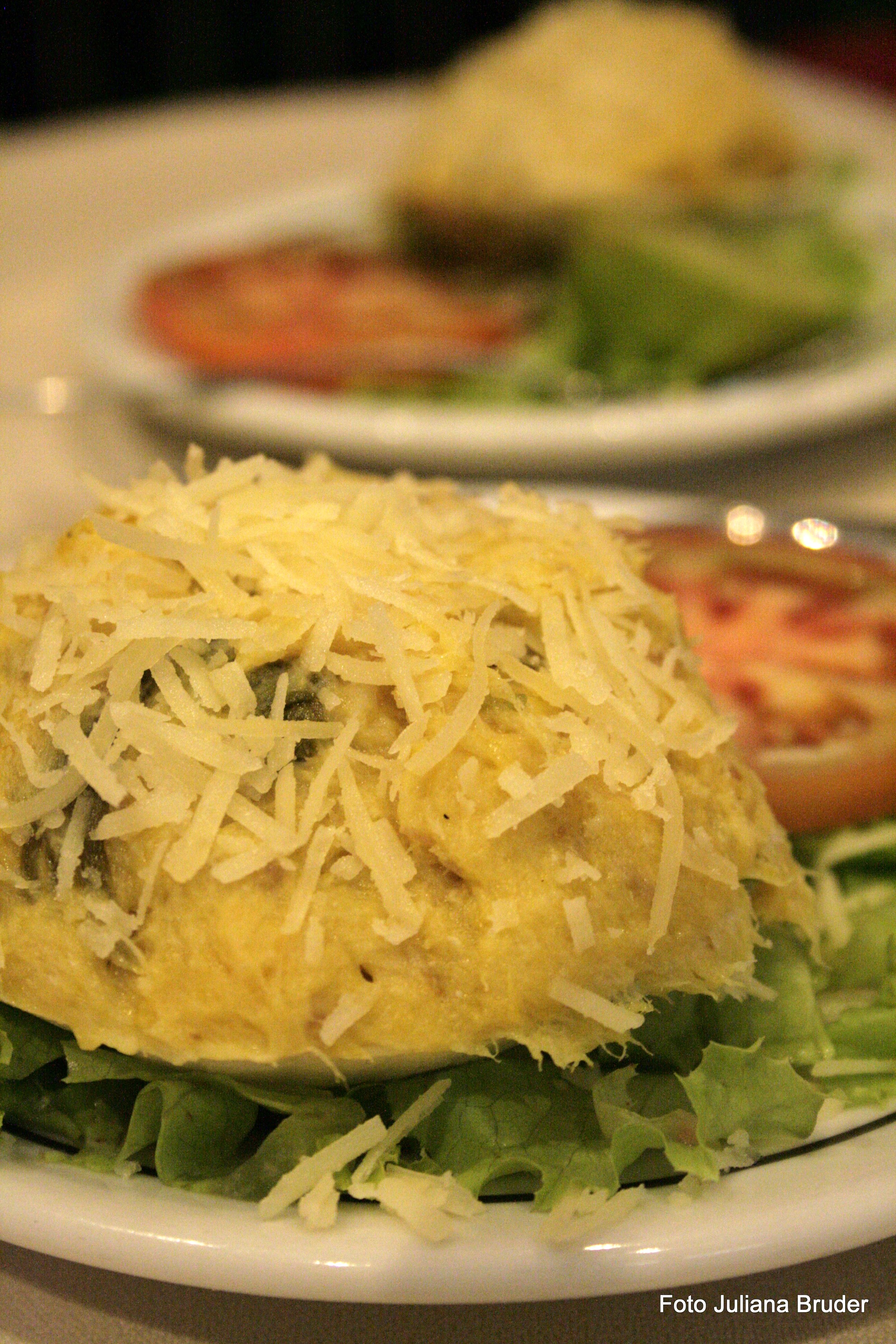 A entrada, feita com delicadeza, apresenta sabor leve e boa cremosidade. Servida em cama de folhas e tomate. Além disso, só o queijo parmesão ralado por cima e um pouquinho de pimenta.
