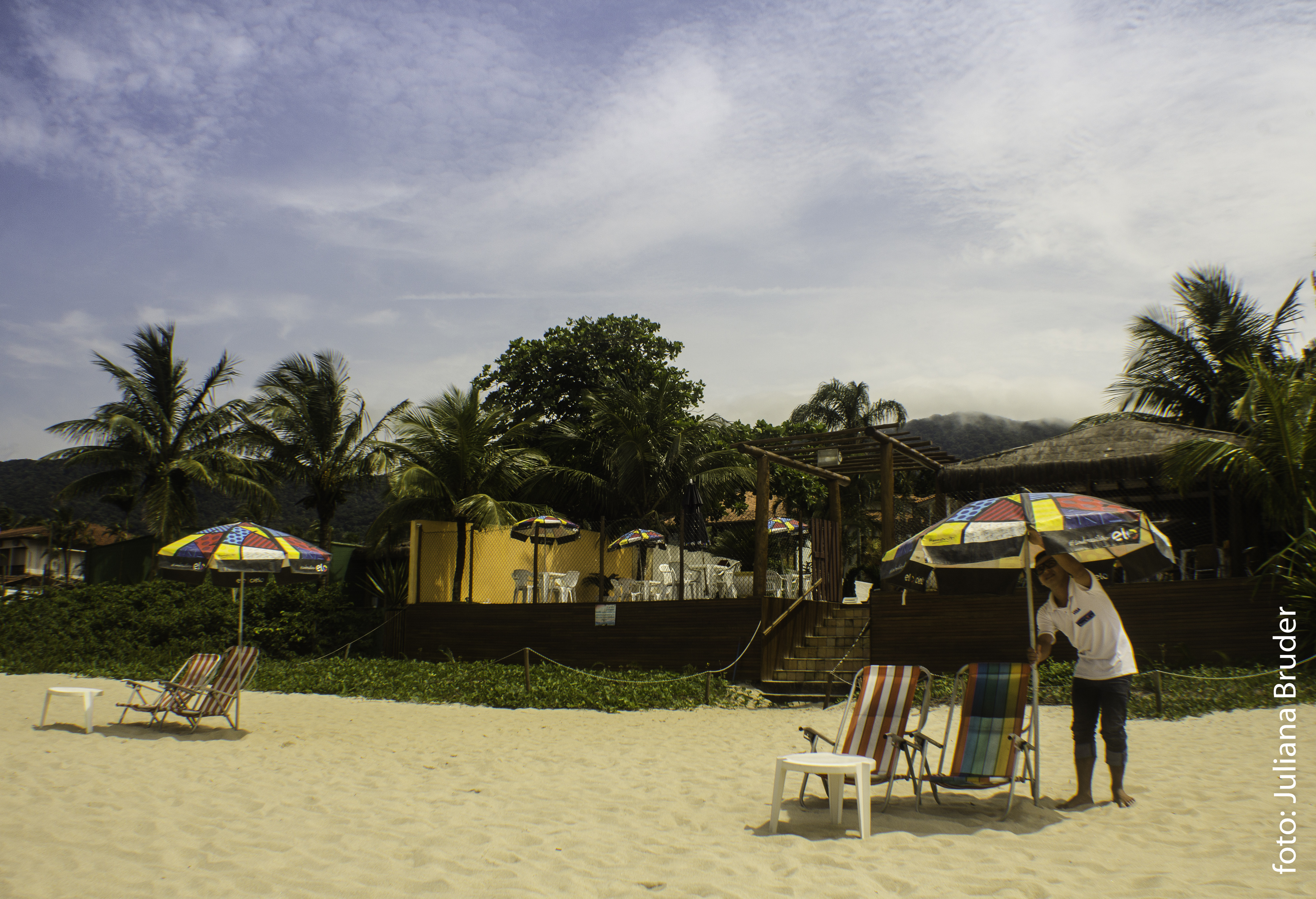 Na hora da praia os hóspedes contam com cadeiras e guarda sóis colocados na faixa em frente à pousada, além de plaquetinha para solicitar o serviço de bar, que inclui porções, drinks e até refeições.