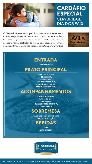 O Staybridge Suites São Paulo – localizado no bairro do Itaim Bibi, preparou um presente especial para seu pai com o melhor de São Paulo; por R$ 499,00 em apartamento categoria Studio para duas pessoas, com direito a café da manhã, 01 vaga no estacionamento, late check out até às 18h e almoço no dia 10/08 no restaurante Ávila.