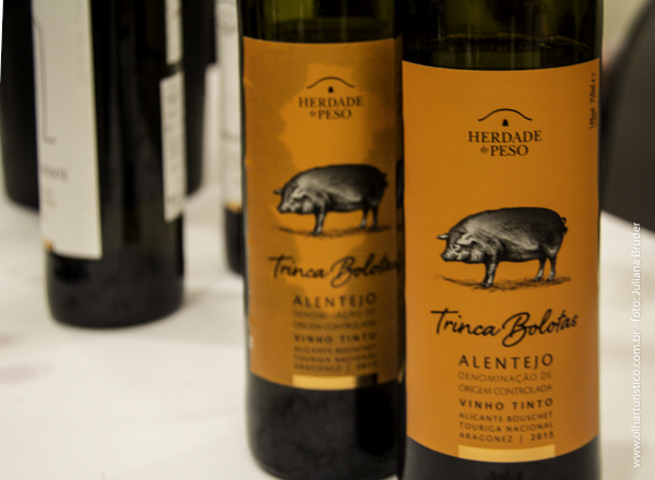 A Herdade do Peso apresentou o Trinca Bolotas, cujo suíno típico da região, o “boloteiro”, se alimenta exclusivamente de bolotas e representa um símbolo da região assim como os vinhos do Alentejo. Um vinho levemente encorpado, com taninos perfeitos e acidez fresca que é mantiodo em barrica por seis meses. Uvas Alicante Bouschet (44%), Touriga Nacional (40%) e Aragonêz (16%). A Alicante Bouschet pode ser sentida na coloração, no volume e nos aromas, já a Touriga Nacional dá um toque floral e o Aragonês fecha com aromas de frutas. Vai bem com carnes.